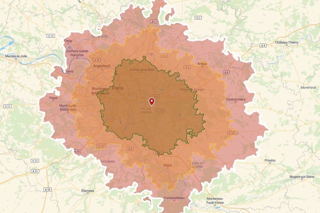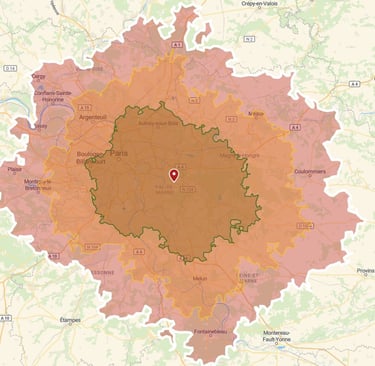 Zone jaune : 5€ de frais de déplacement entre 30 et 45km de La Queue en Brie (94)